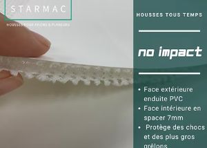 Elles sont réalisées dans notre complexe textile technique deux couches “No Impact” qui permet une aération de la face en contact avec l’appareil tout en étant imperméable et robuste. Elles sont pérennes.
