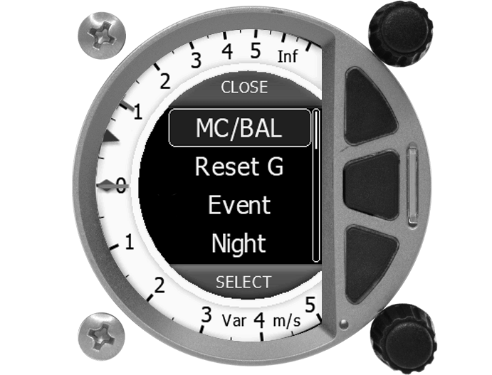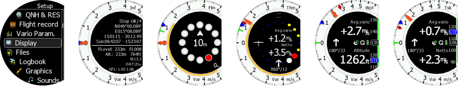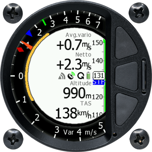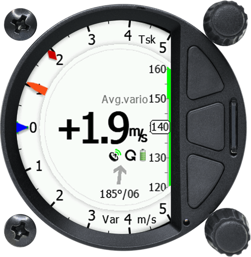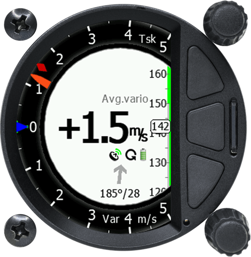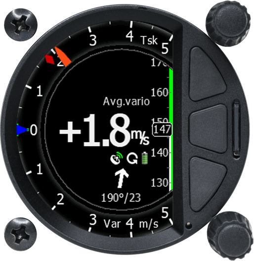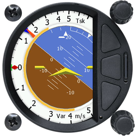 Trois capteurs pneumatiques assurent la compensation électronique ou thermique, ainsi qu’une plateforme inertielle intégrée avec accéléromètre de +-8 g et trois gyroscopes pour des mesures vario précises et rapides. Un module AHRS intégré permet le calcul du vent. La page graphique AHRS est activée après l’achat d’une option AHRS.