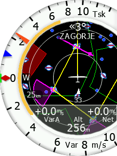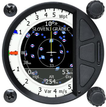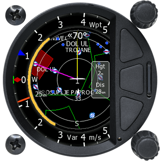 Avec calculateur de plané final et système de navigation avec carte mobile. 2 boutons rotatifs, 3 boutons poussoirs et carte SD. Manipulation simplifiée en vol ou au sol. Carte SD pour l’échange de données (mise à jour logicielle, fichiers d’espaces aériens, fichiers de points de cheminement, téléchargements de vols). Les PDA ou smartphones peuvent être connectés au système via Bluetooth externe ou directement au port PDA. Les enregistreurs Flarm/PowerFlarm/GPS/IGC peuvent être connectés à un port GPS.
