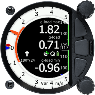 Plateforme inertielle intégrée avec accéléromètre de +-8 g. L’appareil affiche la charge g actuelle dans la boîte de navigation/aiguille et ses valeurs minimales et maximales en barres. Les boîtes de navigation de charge minimale et maximale du dernier vol sont conservées jusqu’au prochain vol. Informations très utiles pour les vols de voltige!